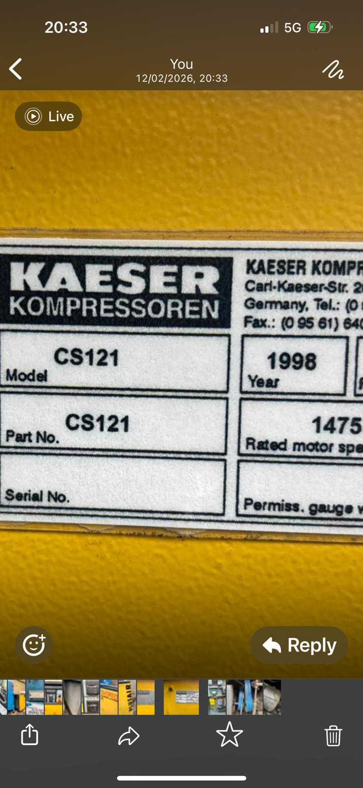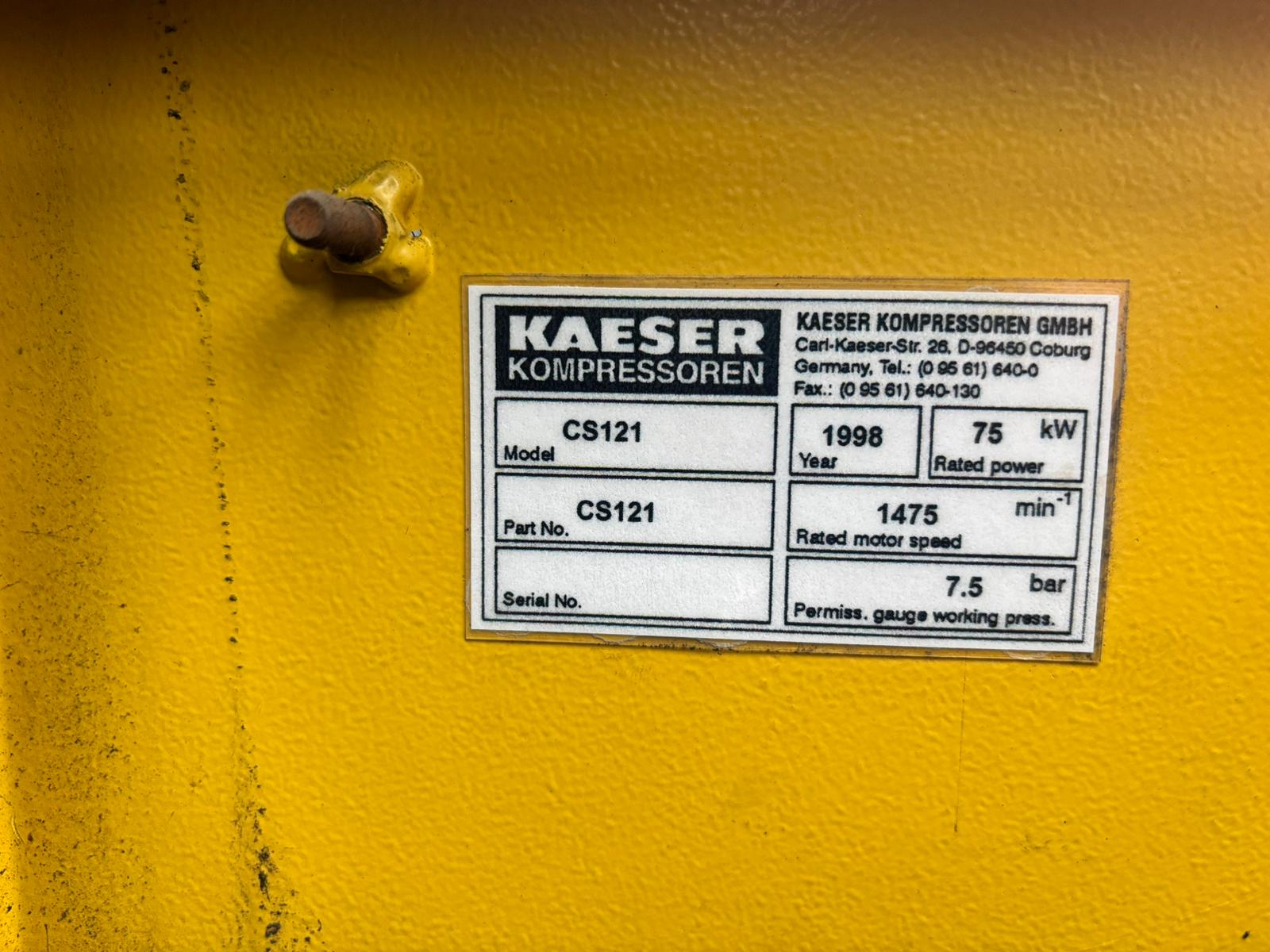 KAESER CS121 75KW ROTARY SCREW AIR COMPRESSOR + 930 LITRE AIR RECEIVER TANK 400V 3 PHASE 7.5 BAR